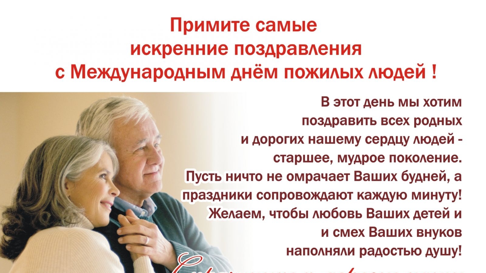 В Международный день пожилых людей желаем вам улыбок, добра и человеческого тепла. Пусть каждый будет одарен вниманием и пониманием родных, заботой и душевностью. Долгих вам лет жизни, здоровья и мира в душе. За вашу жизнь вы сделали так много, что заслуживаете уважения, достатка и благополучия. Счастья вам!