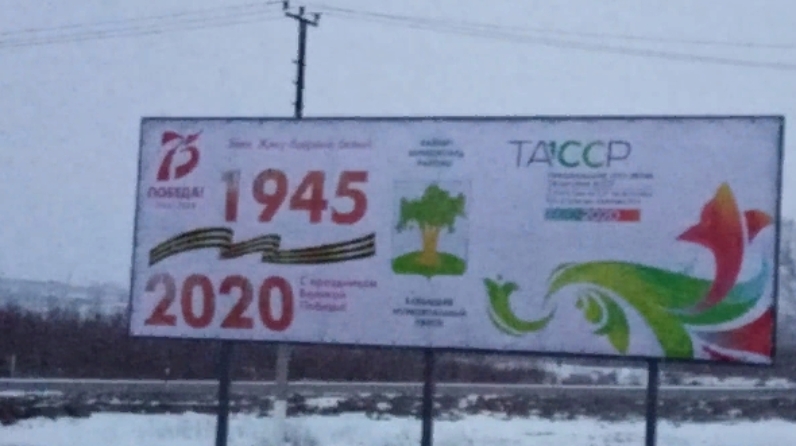 Бөек Җиңүнең 75 еллыгы һәм ТАССР төзелүнең 100 еллыгы логотиплы щит урнаштырылган.